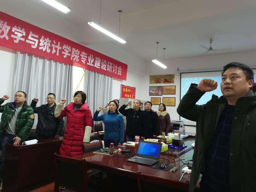 主题党日按照“回顾初心、党性教育、民主议事、实践锻炼”四个板块要求进行,全体党员首先在学院会议室集中进行奏唱国歌、重温入党誓词两项议程。主题党日由数学与应用数学系教师党支部书记杨艳主持、信息与计算科学系教师党支部书记陶茂虎领誓。