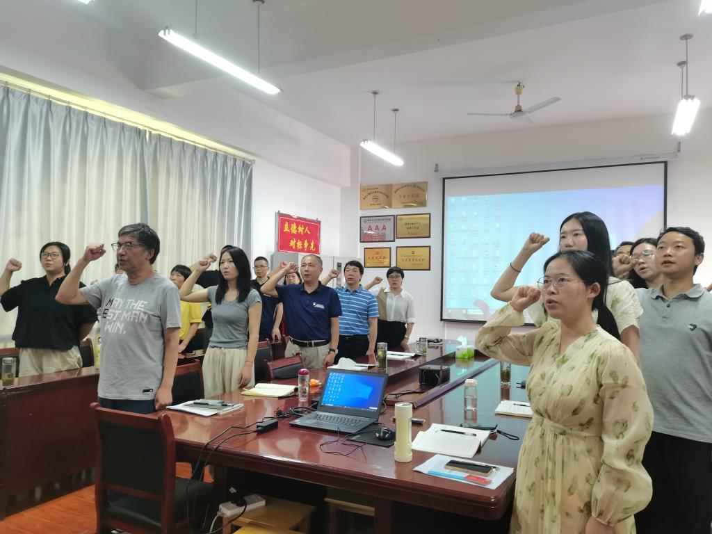主题党日按照“回顾初心、党性教育、民主议事、实践锻炼”四个板块要求进行,全体党员首先在学院会议室集中进行奏唱国歌、重温入党誓词两项议程,由行政党支部书记耿付荃主持、数学与应用数学专业学生党支部书记卢京希领誓。