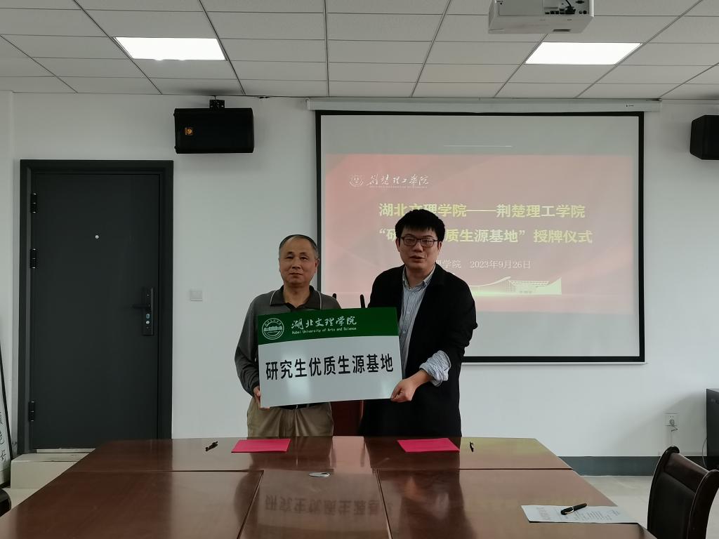 刘浩与杜锋签订共建研究生优质生源基地协议,刘浩向荆楚理工学院数理学院研究生优质生源基地授牌。