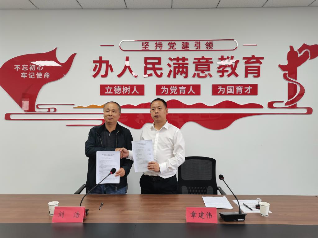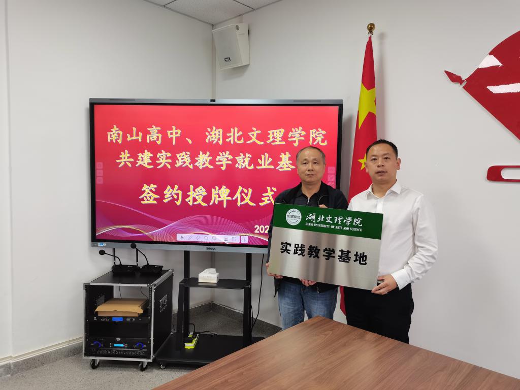 刘浩代表学院与竹山县南山五福堂高级中学签订实践教学和就业基地合作协议,并向竹山县南山五福堂高级中学实践教学和就业基地授牌。