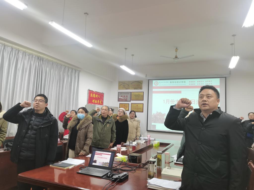 主题党日按照“回顾初心、党性教育、民主议事、实践锻炼”四个板块要求进行,全体党员首先在学院会议室集中进行奏唱国歌、重温入党誓词两项议程,由信息与计算科学系教师党支部书记陶茂虎主持、数学与应用数学系教师党支部书记张敏捷领誓。