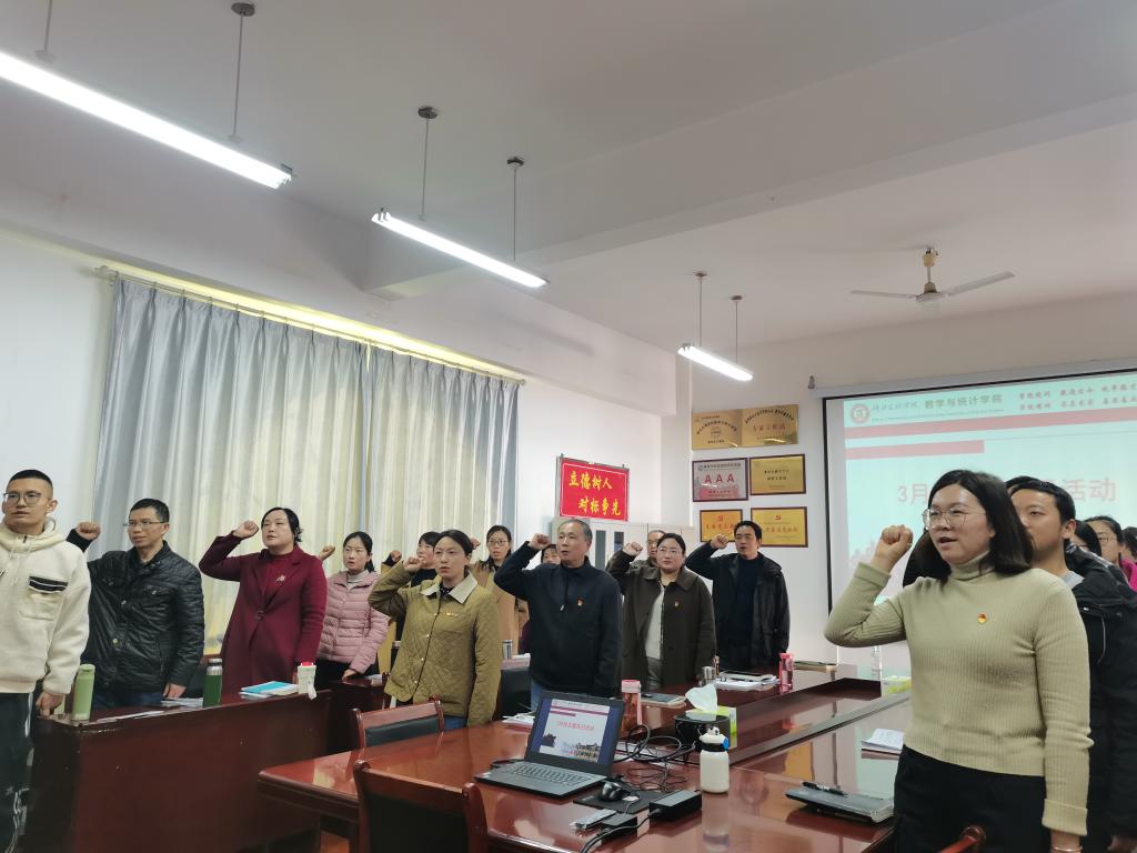 主题党日按照“回顾初心、党性教育、民主议事、实践锻炼”四个板块要求进行,全体党员首先在学院会议室集中进行奏唱国歌、重温入党誓词两项议程,由信息与计算科学系教师党支部书记陶茂虎主持、数学与应用数学系教师党支部书记张敏捷领誓。