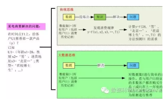 3.对方法论的新认识——从“基于知识解决问题”到“基于数据解决问题”。我们传统的方法论往往是“基于知识”的,即从“大量实践(数据)”中总结和提炼出一般性知识(定理、模式、模型、函数等)之后,用知识去解决(或解释)问题。因此,传统的问题解决思路是“问题→知识→问题”,即根据问题找“知识”,并用“知识”解决“问题”。然而,数据科学中兴起了另一种方法论——“问题→数据→问题”,即根据问题找“数据”,并直接用数据(不需要把“数据”转换成“知识”的前提下)解决问题,如图3所示。